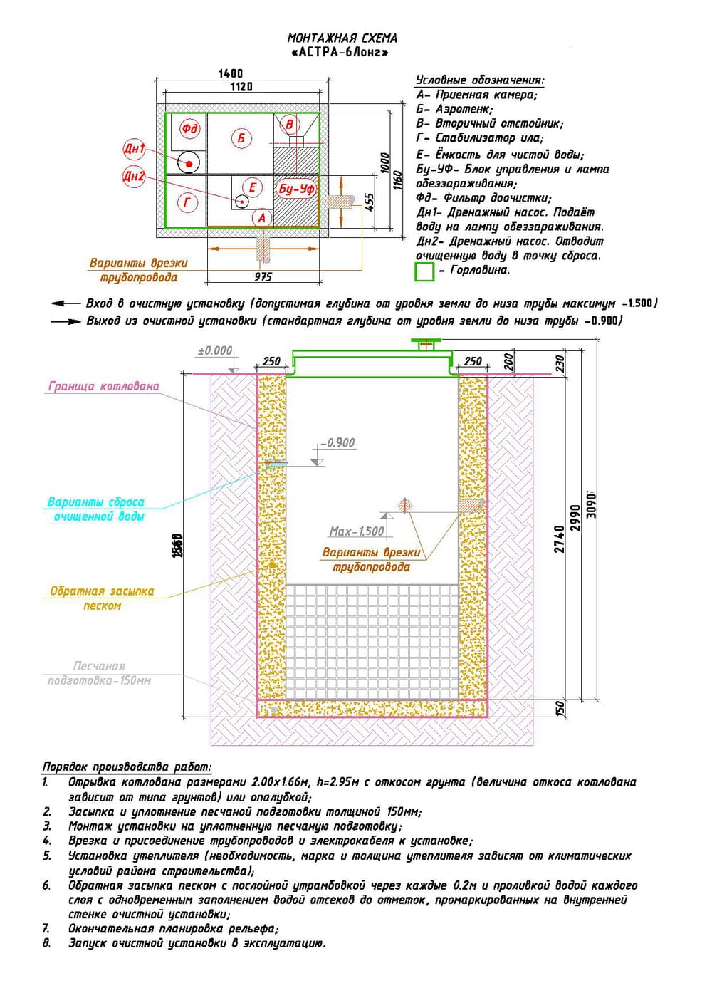 Лонг — высота станции 3,00 м. Врезка (вход трубы) до 1,50 м от уровня земли до нижнего края трубы.
